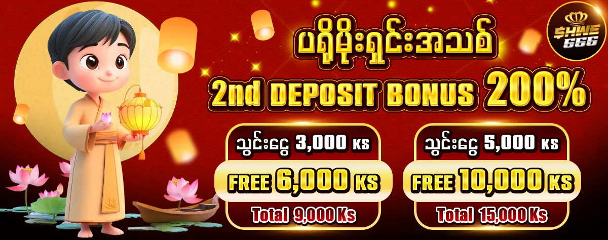 အွန်လိုင်းဂိမ်းပလက်ဖောင်းတွေအတွက် လူကြိုက်များသည့် Promotion များထဲက တစ်ခုကတော့ 2ndDeposit Bonus 200% ဖြစ်ပါတယ်။ ဆိုလိုချင်တာက အကောင့်ဖွင့်ပြီး ပထမဆုံး ငွေသွင်းပြီးနောက် ဒုတိယအကြိမ် ငွေသွင်းသောအခါမှာ မူရင်းငွေထက် 200% ထပ်ပေးမယ့် Bonus ဖြစ်ပါတယ်။