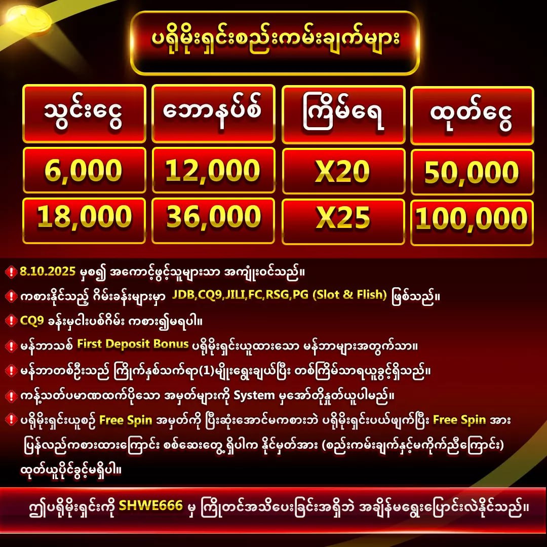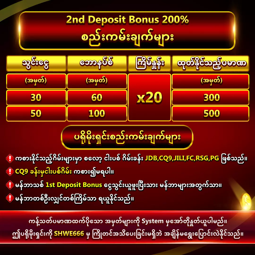 ဥပမာ – မန်ဘာတစ်ဦးက ဒုတိယအကြိမ်အနေနဲ့ 10,000 ကျပ် သွင်းမယ်ဆိုရင် အထက်ထပ် 20,000 ကျပ်ကို Bonus အဖြစ် ထပ်ပေးသည့်အတွက် စုစုပေါင်း 30,000 ကျပ်နဲ့ ဂိမ်းစတင်ကစားနိုင်မယ်။