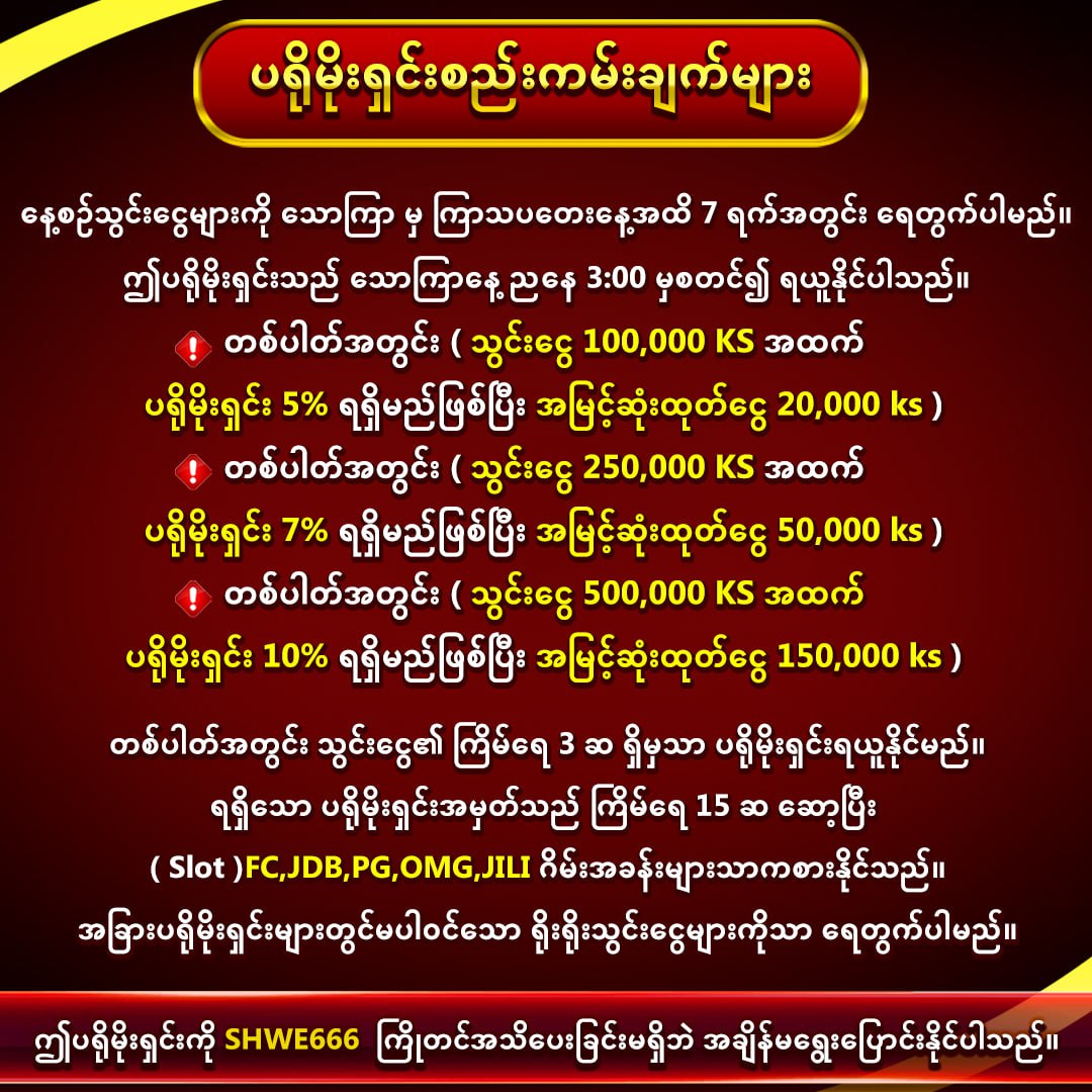 ဒါပေမဲ့ အဓိကအချက်ကတော့ SHWE666 က ပရိုမိုးရှင်းကို သီးသန့်ရက်အချို့အတွက်ပေးတာမဟုတ်ပါ။ အပတ်တိုင်း သက်တမ်းရှိတာကြောင့် သင်အပတ်တိုင်း အမြတ်အပြည့်နဲ့ကစားနိုင်ပါတယ်။