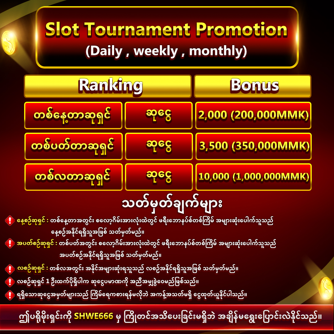 • အဆင့်လိုက် Promotion – Level မြင့်သလောက် Bonus, Cash Back, Free Spin များ ပိုမိုရနိုင်သည်