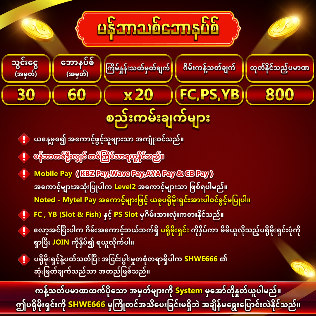 ထို့ကြောင့် 2025 ခုနှစ်အတွက် မန်ဘာအသစ်အဟောင်းမရွေး အားလုံးအတွက် အနည်းငယ်နဲ့ စတင်နိုင်ပြီး အများကြီးအနိုင်ရနိုင်မယ့် Promotion တစ်ခုအဖြစ် သတ်မှတ်နိုင်ပါသည်။